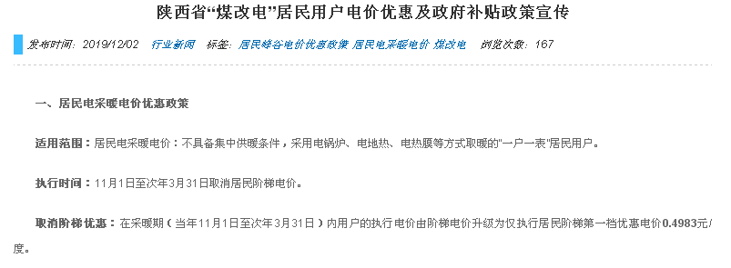 陜西省居民電采暖電價優惠政策